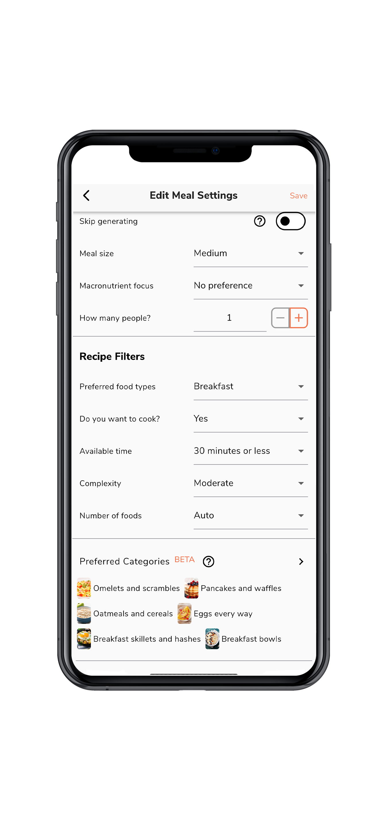 Preferred Categories (BETA) allows you to teach AI what each MEAL means to you. The app gets smarter and more personalized the more you use it.